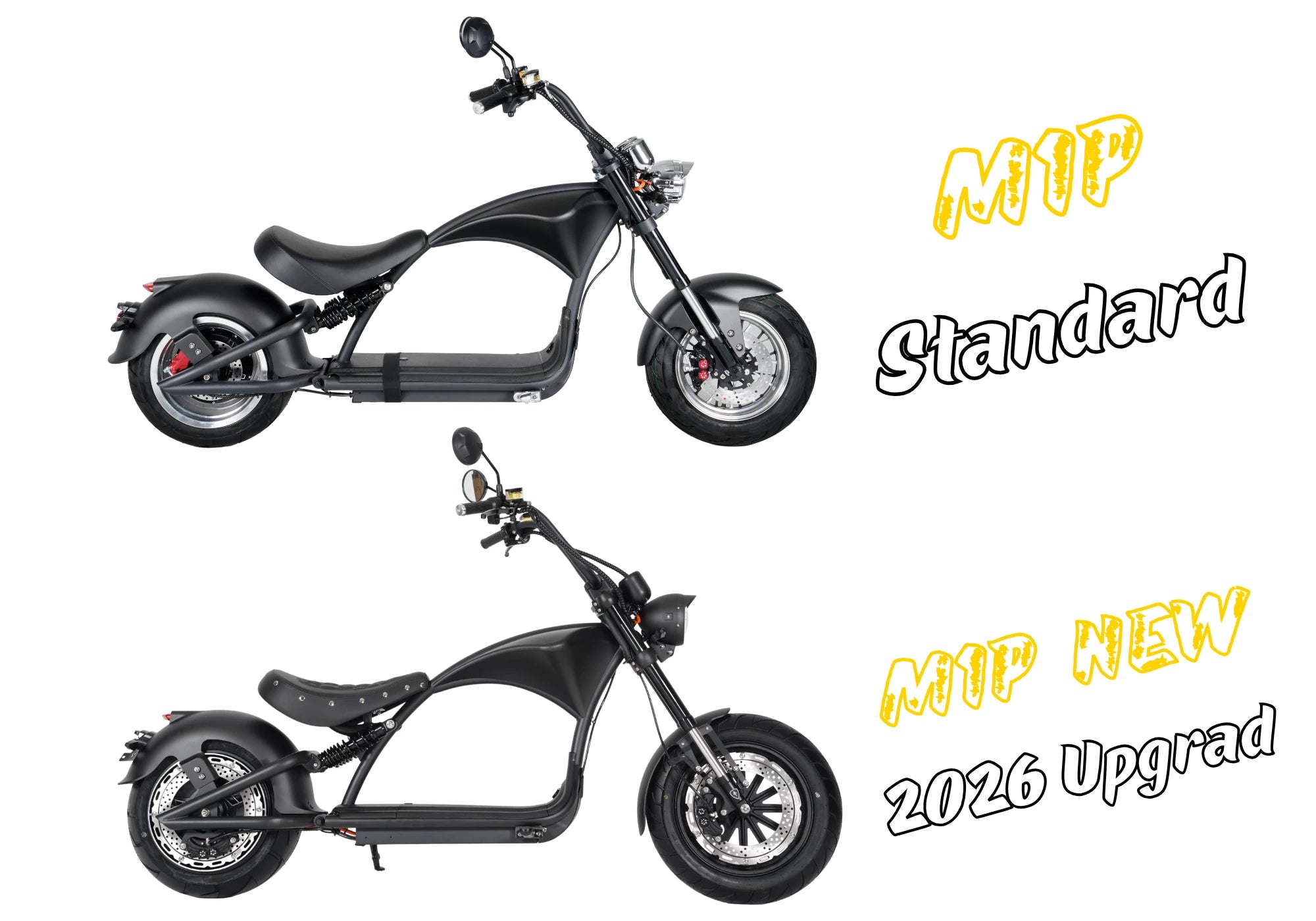 Mangosteen Chopper M1P is an innovative e‑chopper/e‑scooter with a top speed of 45 km/h that is approved for road use. The combination of alloy rims, perforated hydraulic disc brakes, and tubeless wide tires ensures excellent handling, precise braking, and significantly better damping on bumpy roads.